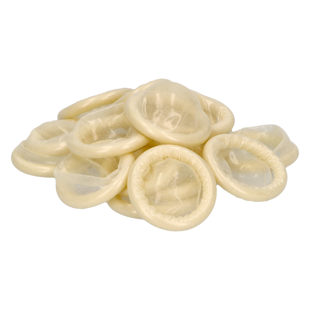 Osłonki wykonane z naturalnego białego lateksu, lekko pudrowane, pakowane pojedynczo w aluminiowy blister.