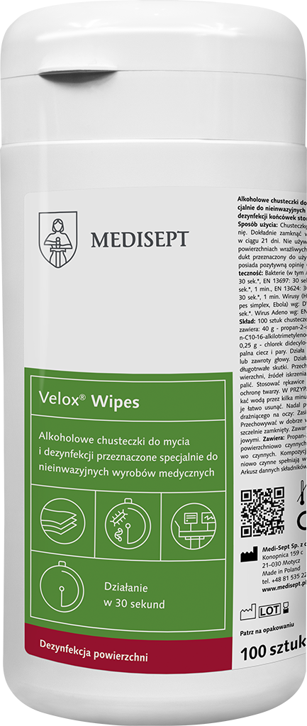 Zastosowanie: Velox® Wipes zalecane są specjalnie do mycia i szybkiej dezynfekcji nieinwazyjnych wyrobów medycznych: łóżek i foteli zabiegowych, aparatury medycznej. Polecane jest również do dezynfekcji końcówek stomatologicznych przed procesem sterylizacji. Preparat nie zawiera aldehydu i fenolu dzięki czemu nie odbarwia dezynfekowanych powierzchni. Dzięki innowacyjnej formule opartej na synergii surfaktantów i technologii nano-miceli produkt posiada szerokie spektrum bójcze i wyjątkowe właściwości myjące. Posiadają pozytywną opinię producenta sprzętu medycznego Famed. Posiadają przyjemny świeży zapach.
