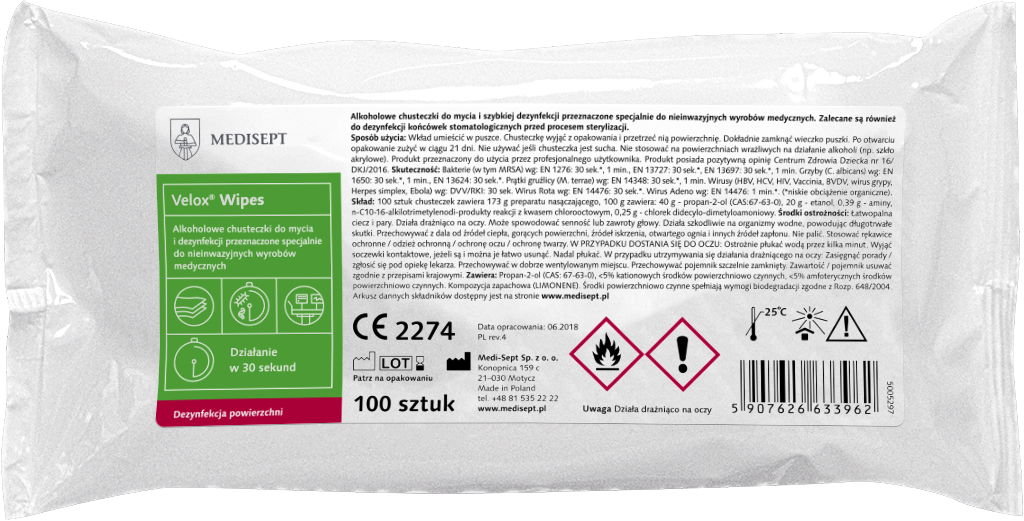 Zastosowanie: Velox® Wipes zalecane są specjalnie do mycia i szybkiej dezynfekcji nieinwazyjnych wyrobów medycznych: łóżek i foteli zabiegowych, aparatury medycznej. Polecane jest również do dezynfekcji końcówek stomatologicznych przed procesem sterylizacji. Preparat nie zawiera aldehydu i fenolu dzięki czemu nie odbarwia dezynfekowanych powierzchni. Dzięki innowacyjnej formule opartej na synergii surfaktantów i technologii nano-miceli produkt posiada szerokie spektrum bójcze i wyjątkowe właściwości myjące. Posiadają pozytywną opinię producenta sprzętu medycznego Famed. Posiadają przyjemny świeży zapach.