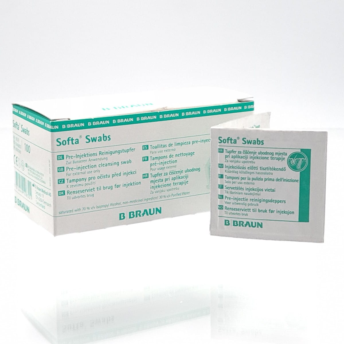 Softa® Swabs - gaziki do oczyszczania i dezynfekcji skóry przed zastrzykiem są nasączone 70% alkoholem izopropylowym.