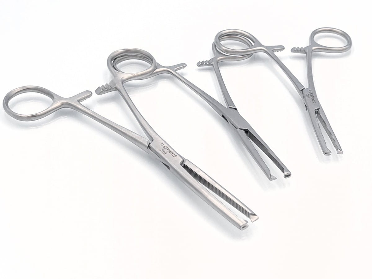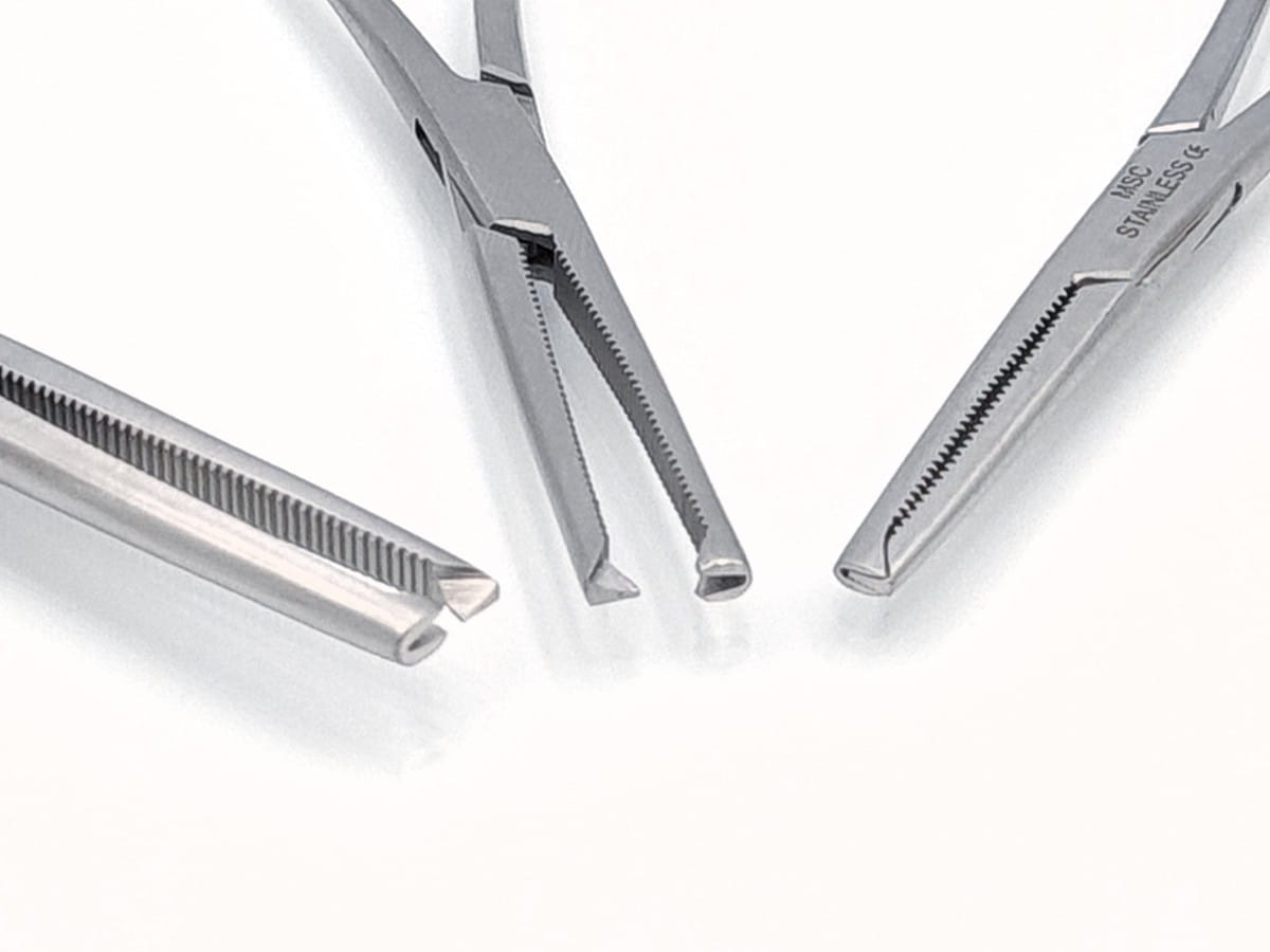 Kleszcze chirurgiczne, naczyniowe Kocher, wewnątrzna część kleszczy poprzecznie rowkowana, zkończone ząbkami 1:2