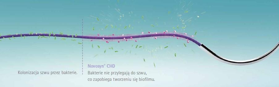Novosyn® CHD hamuje kolonizowanie szwu przez najczęstsze patogeny wywołujące ZMO, w tym Staphylococcus aureus, metycylinooporny Staphylococcus aureus (MRSA), Staphylococcus epidermidis, metycylinooporny Staphylococcus epidermidis (MRSE)