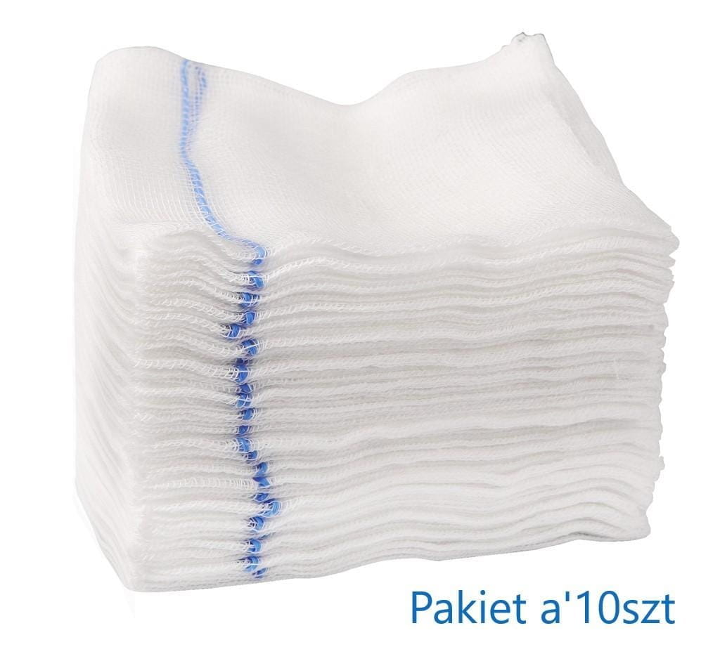 Pakiet kompresów gazowych steryl. 7,5 × 7,5 cm, 17 nitek, 8 warstw, z nitką RTG opakowanie 10 szt., karton 100 szt., TZMO