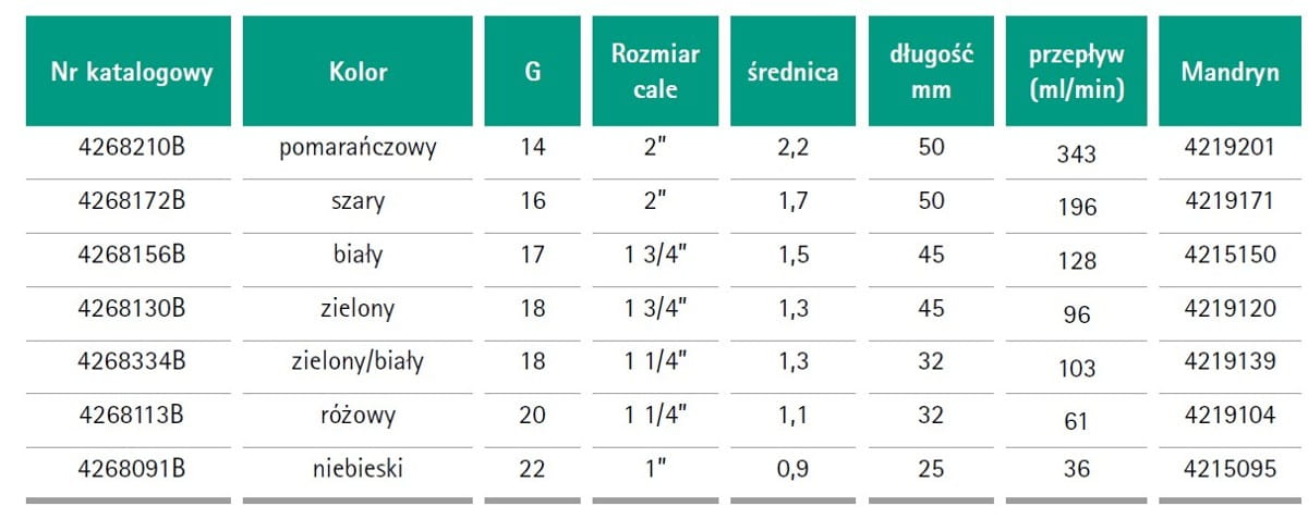 - plastikowa kaniula wykonana z FEP teflonu z czterema w pełni wtopionymi paskami kontrastującymi w promieniach RTG