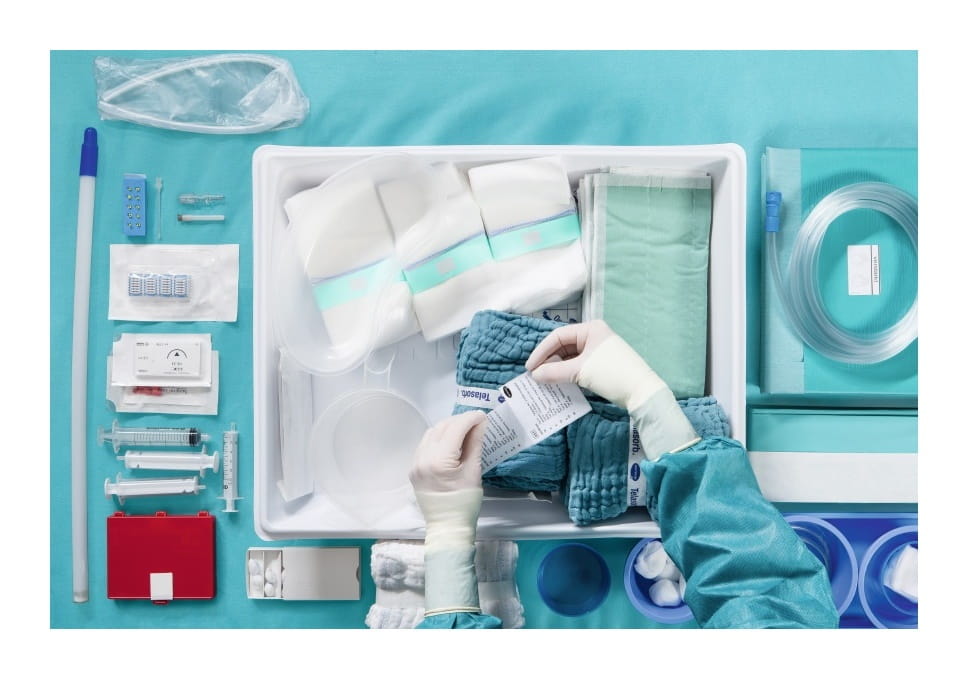 Sterylny pakiet porodowy, zawierający kompletny zestaw materiałów medycznych, niezbędnych do przeprowadzenia procedury porodu nagłego w każdych warunkach.